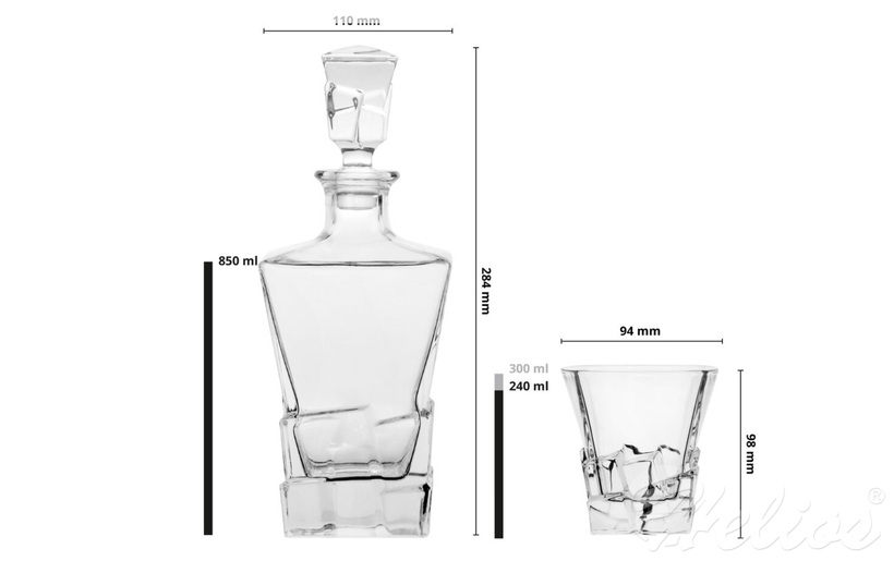 Ekskluzywny zestaw do serwowania whisky łączy nowoczesny design z elegancją klasycznego szkła. W komplecie znajduje się karafka o pojemności 850 ml o oryginalnym, geometrycznym kształcie oraz dwie stylowe szklanki z efektowną podstawą inspirowaną kostkami lodu. Całość zapakowana w eleganckie pudełko prezentowe – idealne na wyjątkowy upominek.